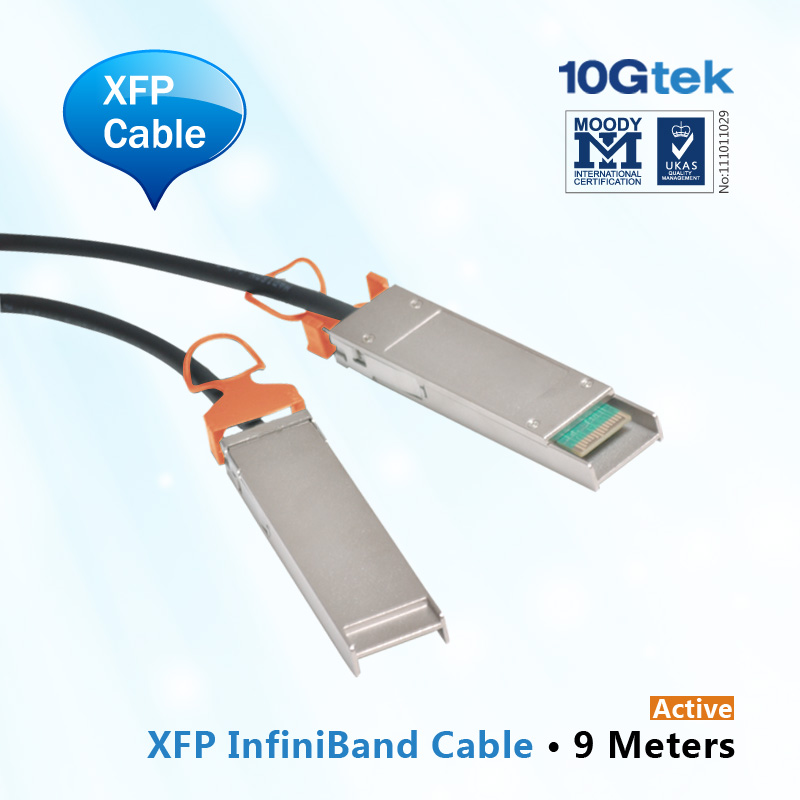 XFP Infiband Cables were developed to provide 10Gb/s serial links for a wide range of applications including standards such as OC192/STM-64, G.709, and 10 Gigabit Ethernet, 10G Fibre Channel, and other industry standards. It is ideally suited for 10 GbE datacom (belly-to-belly for high density applications) and storage area network (SAN/NAS) applications based on the IEEE 802.3ae and Fibre Channel standards.